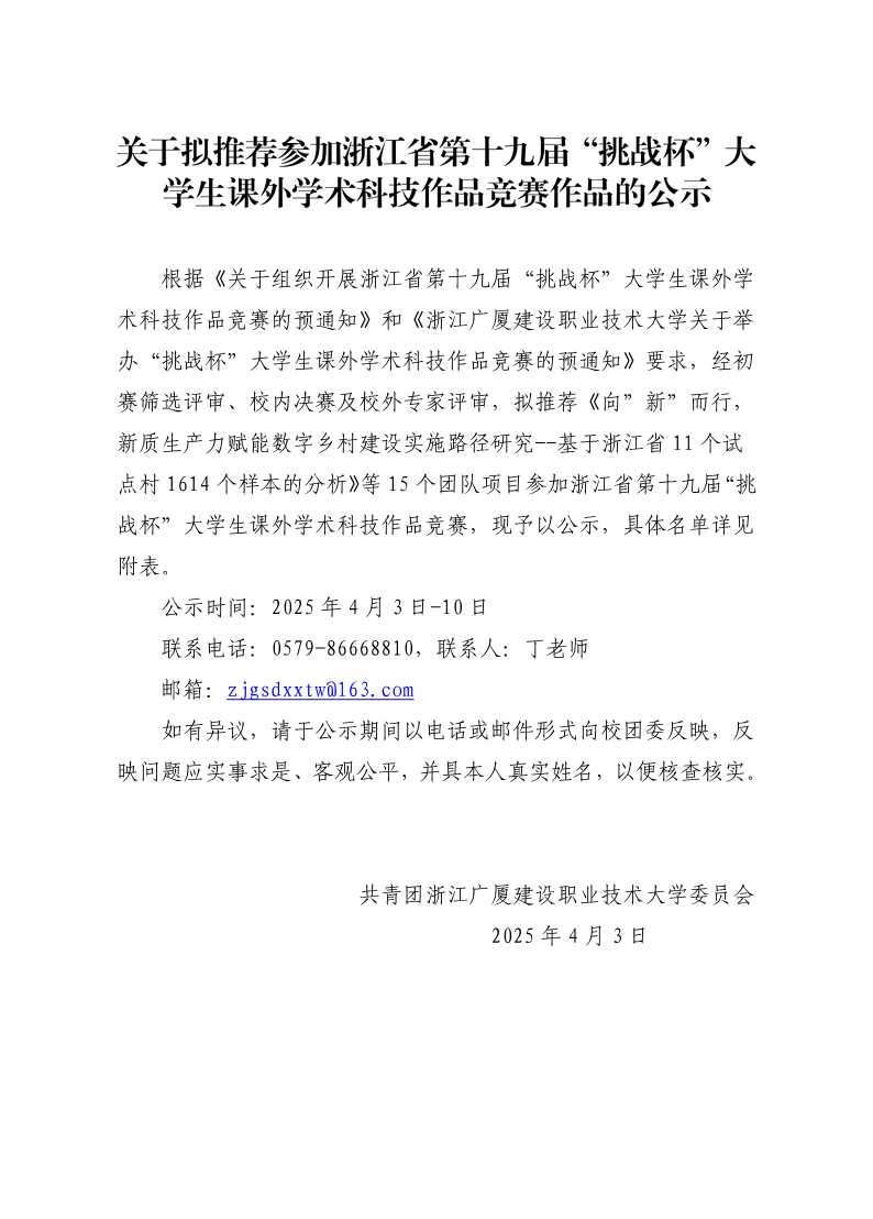 关于拟推荐参加浙江省第十九届“挑战杯”大学生课外学术科技作品竞赛作品的公示 来源: 作者: 发布时间:2025-04-03 浏览次数: 次 【字体:小 大】 终审:校办公室管理员 【打印正文】 相关信息