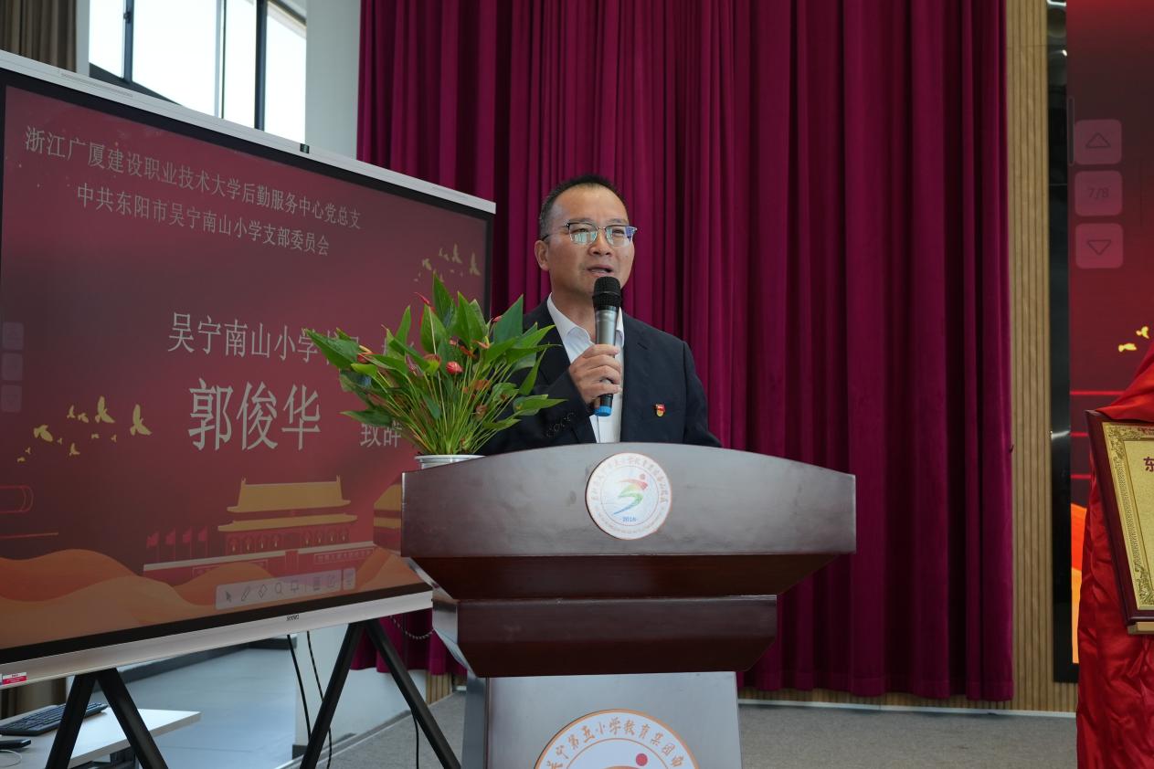 签约仪式由浙江广厦大学后勤服务中心精心筹备,得到了校方及东阳市吴宁南山小学的高度关注和支持。出席签约仪式的主要领导包括:浙江广厦大学党委委员、副校长王兴,东阳市吴宁南山小学书记、校长郭俊华,浙江广厦大学后勤服务中心党总支第一支部书记周标棠,第二支部书记杜德龙,以及广大后勤服务公司总经理胡飞燕等。